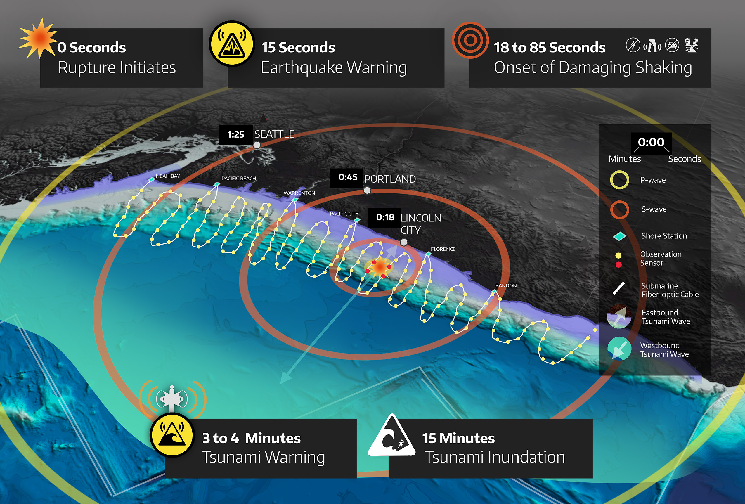 Tsunamis resulting from megathrust earthquakes have taken the lives of millions and caused hundreds of billions of dollars in damages. To prevent such destruction by future tsunamis, authorities plan to install acoustic pressure sensors on the seafloor to act as an early-warning system. At the core of designing such an early-warning system lies the ability to — in real-time — infer the spatiotemporal seafloor deformation from the pressure data and use the inferred deformation to predict the trajectory of a potential tsunami. To this end, we aim to create a digital twin for the Cascadia subduction zone, one of the targeted regions for installing seafloor pressure sensors. The digital twins we target have the following properties: (1) they employ discretizations of high-fidelity PDEs, leading to extreme scale forward problems; (2) they solve an inverse problem to assimilate observational data to infer uncertain model components followed by a forward prediction of the evolving dynamics; (3) the entire end-to-end data-to-inference-to-prediction computation is carried out in real-time through a Bayesian framework that rigorously accounts for uncertainties.